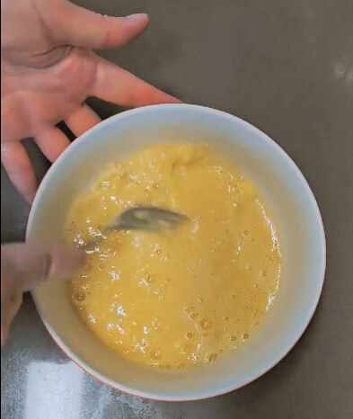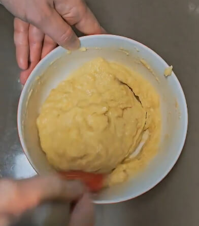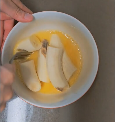 계란물에 바나나 2개를 넣고 포크로 적당히 으깨줍니다. 굳이 곱게 으깨주지 않아도 됩니다. 이것이 귀찮으면 믹서기에 계란과 바나나를 넣고 한 번에 갈아줘도 상관없습니다.