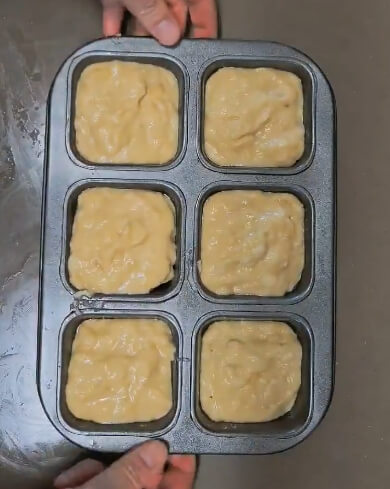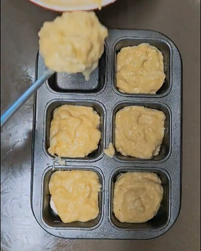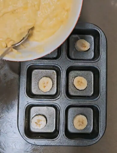 나머지 바나나 1개는 이렇게 머핀 틀에 기름을 바르고 동그랗게 잘라서 넣어주세요. 생략하고 반죽만 넣어줘도 상관없습니다.