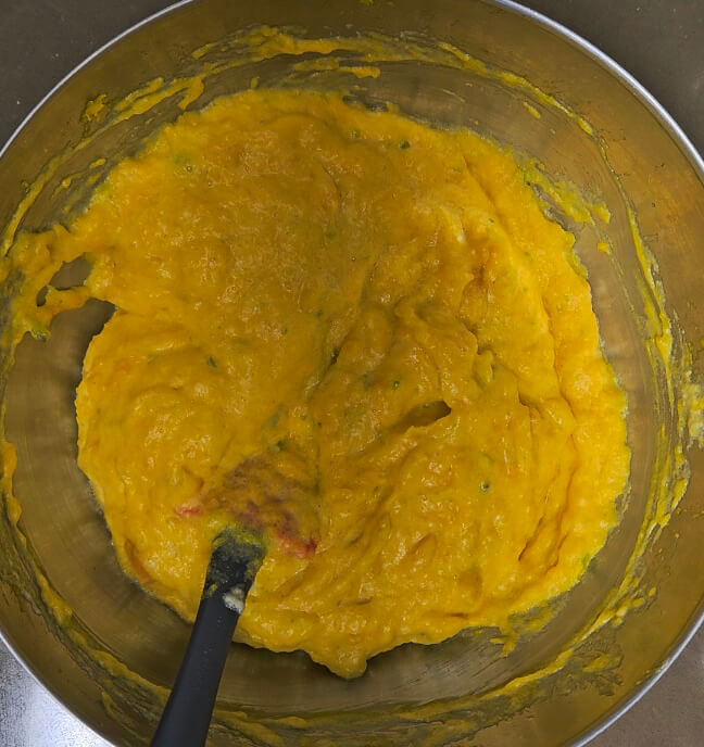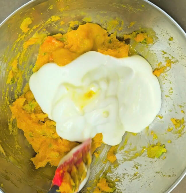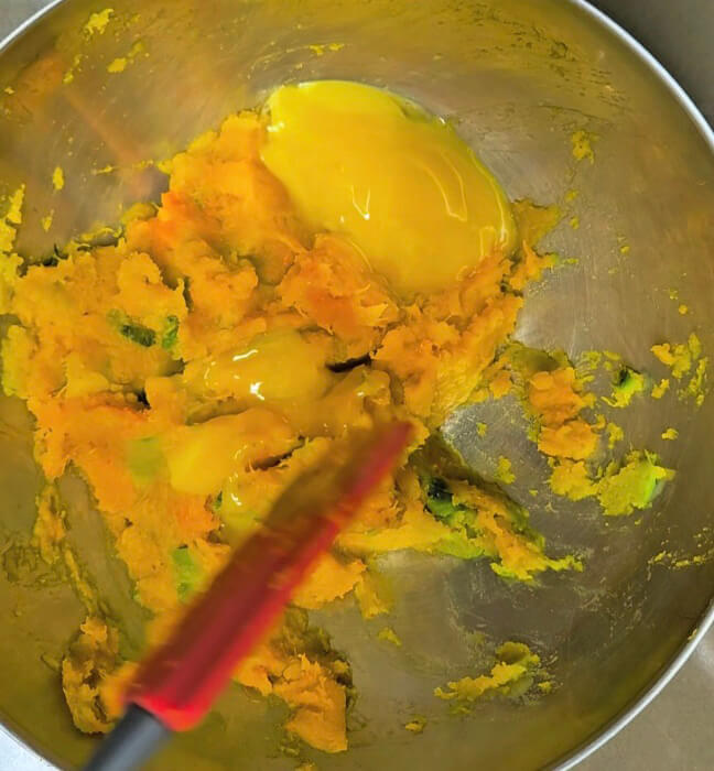 분리해 둔 계란 노른자는 으깬 단호박에 섞어주고 잘 섞어줍니다. 뒤이어 계란 흰자 머랭을 넣어주고 잘 섞어줍니다.
