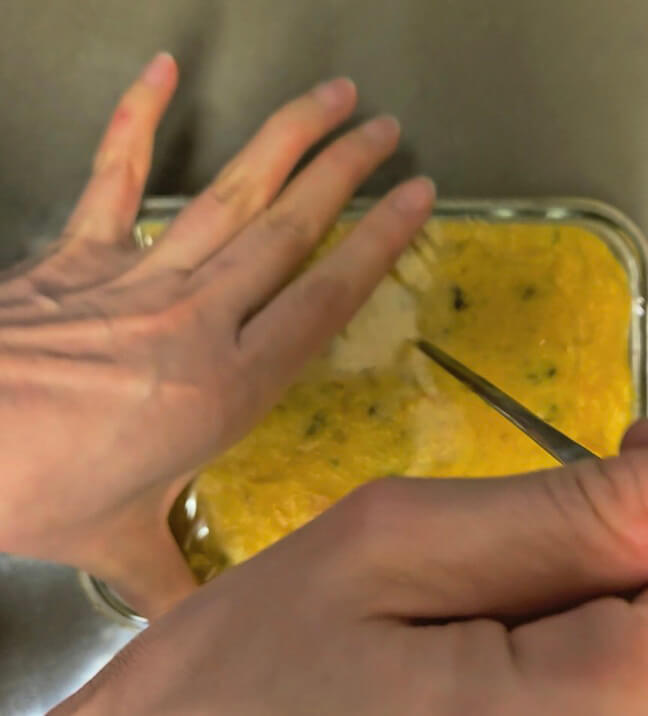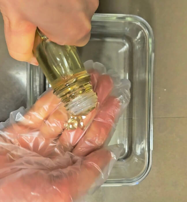 내열용기를 준비하고 반죽이 달라붙지 않도록 비닐장갑을 낀 후 용기에 골고루 기름을 칠해줍니다. 기름이 잘 발린 용기에 반죽을 부어줍니다.
