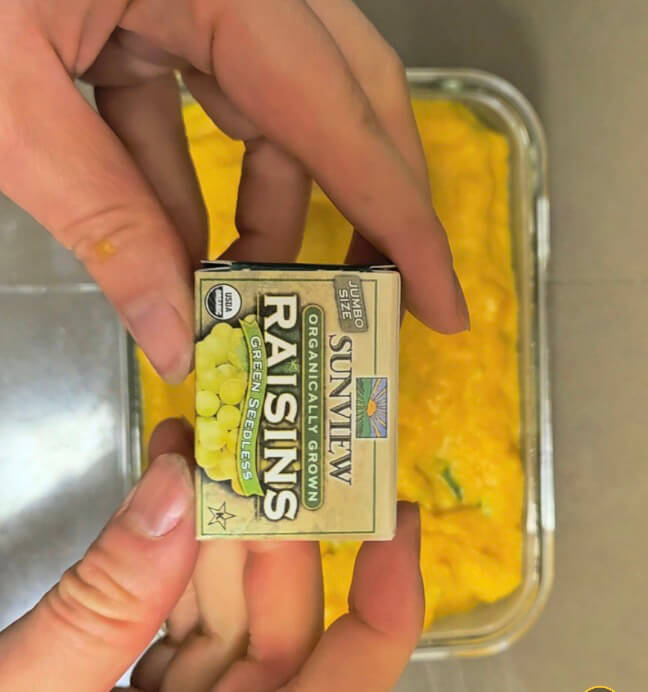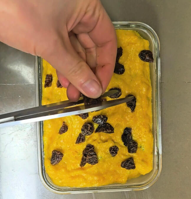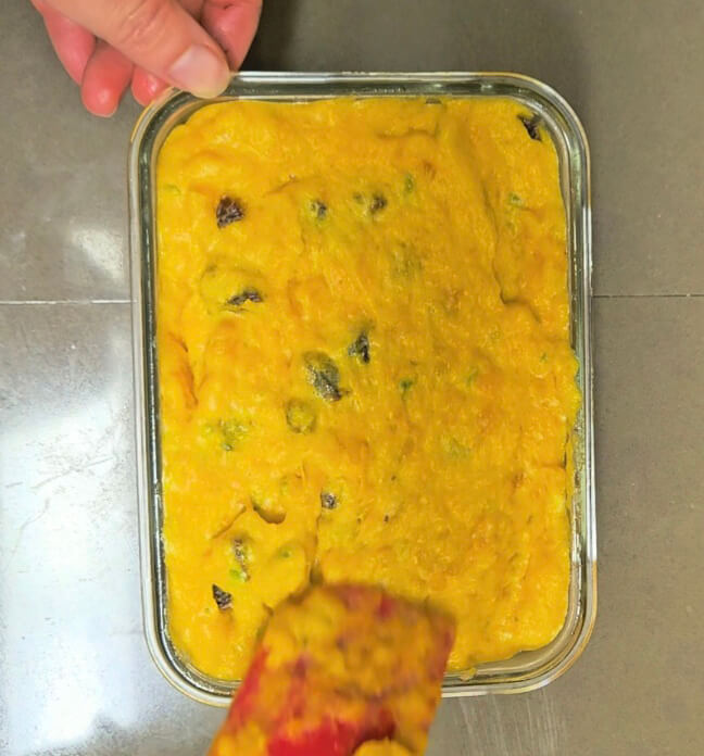 단호박케이크에 풍미를 더하고 싶다면 건포도를 넣거나, 강낭콩 또는 견과류를 살짝 넣어주면 좋겠죠? 건포도가 반죽에 골고루 들어가도록 잘 섞어준 바닥에 '탁탁' 소리가 나도록 몇 번 쳐줍니다.