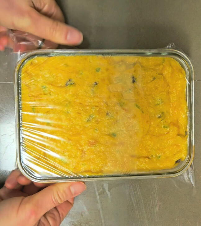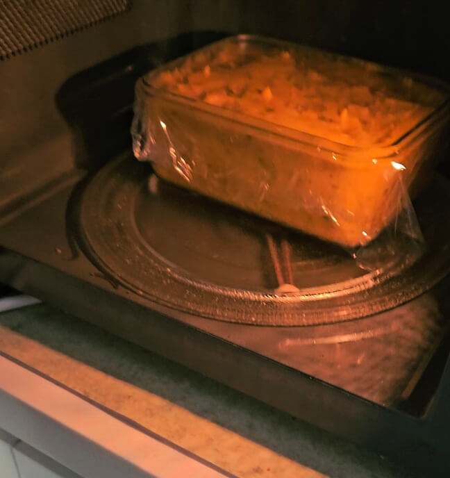 랩을 씌우고 젓가락으로 구멍을 몇 군데 뚫어줍니다. 이후 전자레인지에 놓고 돌려주세요. 저는 찜요리 코스(4분 30초)가 있어서 두 번 정도 돌렸더니 완전히 익었습니다. 아마도 8~10분가량 걸리는 것 같아요.