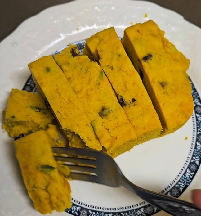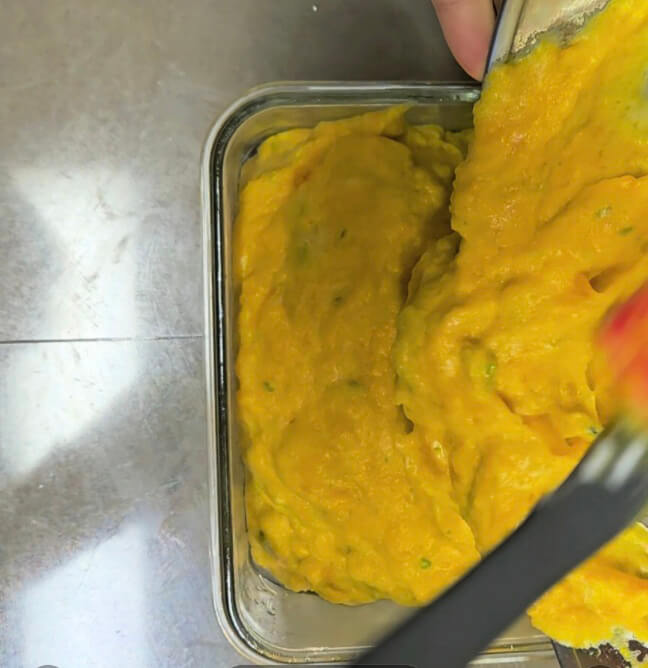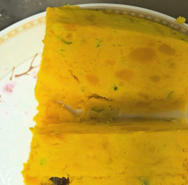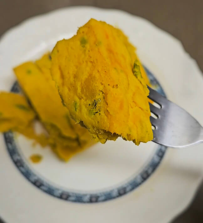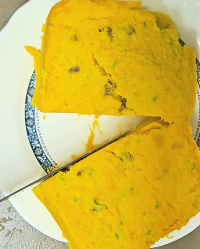 단호박 반통으로 꽤 넉넉한 용량의 단호박케이크가 완성되었어요. 중간에 안 으깨지고 덩어리로 콕 박혀있는 부분 보이시죠? 모양도 예쁘고 그만큼 씹히는 식감이 끝내줍니다.