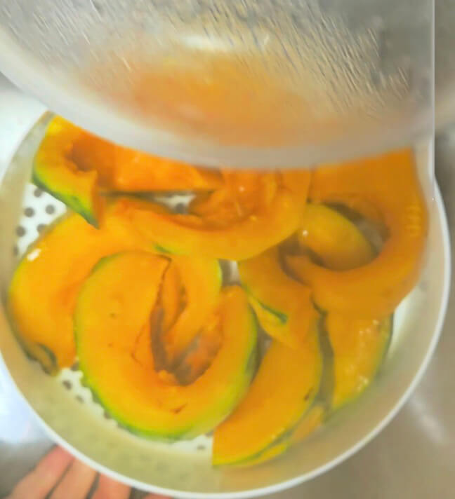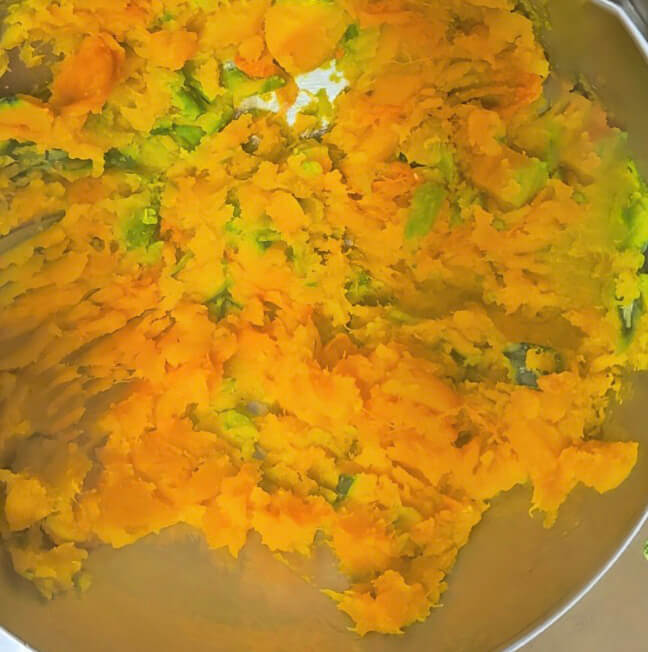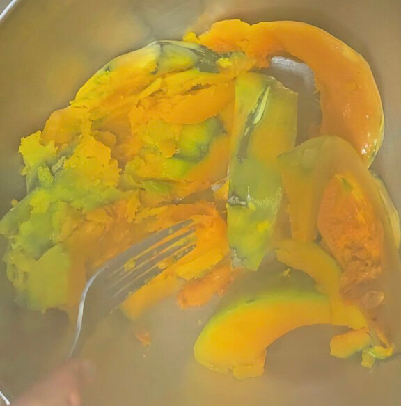 단호박 반통을 잘게 잘라서 전자레인지용 찜기에 넣고 6~8분 가량 돌려줍니다. 다 익은 단호박을 큰 볼에 옮겨 담고 포크로 으깨주세요.