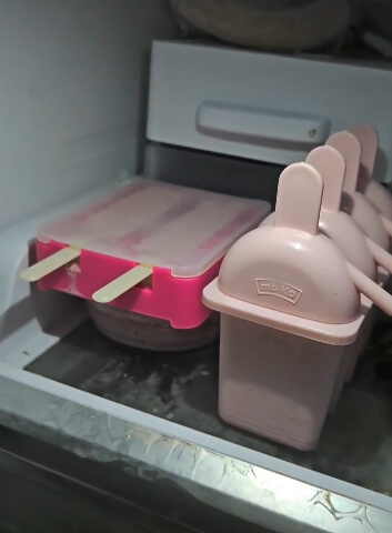 귀염둥이 조카들 오면 주려고 실리콘과 플라스틱으로 된 아이스바 틀에도 넣어서 냉동실에 얼려두었어요.