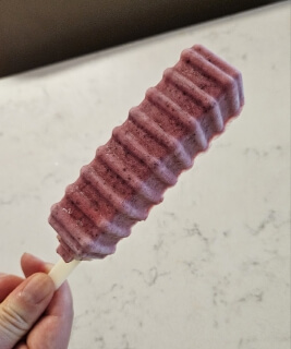 드디어 완성된 아이스바입니다. 확실히 앞서 냉동 딸기로만 만든 스무디/샤베트와 달리 더 새콤달콤 부드러운 맛이 끝내줍니다!